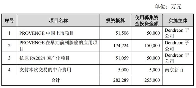 根據南京新百的收購方案,公司擬配套募資25.5億元用于Provenge在中國上市項目、Provenge在早期前列腺癌的應用項目、抗原PA2024國產化項目的建設運營等。