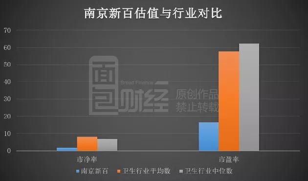 截止2018年7月4日收盤,南京新百總市值146億,市凈率1.8倍,市盈率16.4倍。而統計數據顯示,當前A股醫療衛生行業公司,市凈率中位數為6.96倍,平均數為8.1倍;市盈率中位數為62.4倍,平均數為57.8倍。