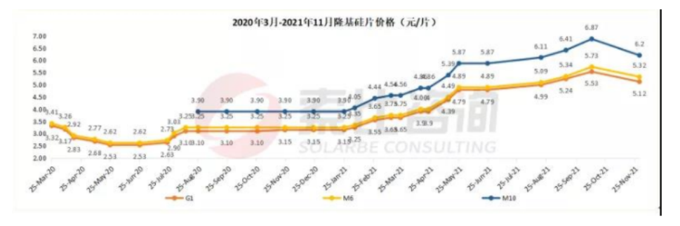 對(duì)標(biāo)11月的硅片價(jià)格,中環(huán)的G1硅片,每片下降0.52元,降幅9.1%;M6硅片下降0.72元,降幅12.48%;G12硅片下降0.55元,降幅6.04%。