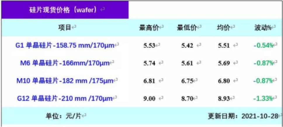 10月下旬,因光伏產(chǎn)業(yè)鏈價(jià)格持續(xù)上漲,終端電站建設(shè)需求低迷,硅片出現(xiàn)了小幅下滑的跡象。由于對(duì)年末搶裝的預(yù)期,硅片價(jià)格隨后企穩(wěn)。