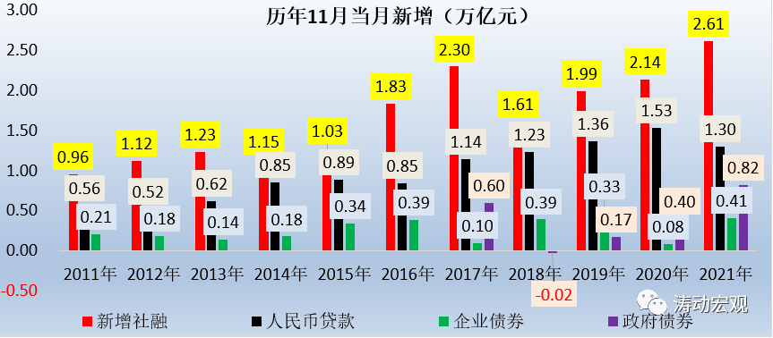 1、受專項(xiàng)債券集中發(fā)行以及地產(chǎn)企業(yè)發(fā)債放松等因素推動(dòng)。例如,今年10-11月政府債券新增1.43萬億元,同比多增0.54萬億元。今年11月,受11月基數(shù)較低(永煤等地方國企違約事件)等因素影響,企業(yè)債券同比多增534億元。