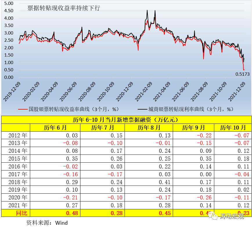 1、今年6月、7月、8月、9、10月和11月當(dāng)月新增票據(jù)融資分別達(dá)到0.27萬億、0.18萬億、0.28萬億、0.14萬億、0.12萬億和0.16萬億元,同比分別多增0.49萬億、0.28萬億、0.45萬億、0.40萬億、0.23萬億和0.03萬億,也就是說6-11月期間票據(jù)融資累計(jì)多增了1.87萬億。這其中的背景便是,3個(gè)月銀票轉(zhuǎn)貼現(xiàn)收益率持續(xù)下行,特別是10月以來已累計(jì)下行200BP至0.50%附近。