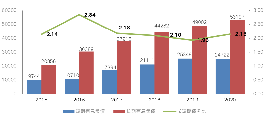 截止2020年末,99家房企的長短期債務比達2.15,較2019年的1.93及2020年中的1.87,均有明顯改善;其中短期有息負債24722億元,相比2019年下降了2%,為歷年來首次出現下滑;長期有息負債較2019年上升了9%至53197億元。