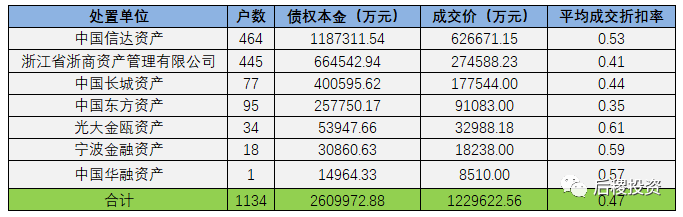 從阿里拍賣平臺中篩選出浙江地區(qū)債權(quán)(超過1000萬)成交記錄,總成交戶數(shù)1497戶,成交債權(quán)總本金341.6億,總成交價(jià)157.8億元,其中持牌AMC出讓比重接近80%。