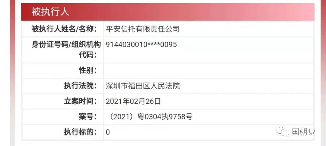 2021年2月26日,平安信托有限責(zé)任公司被深圳市福田區(qū)人民法院列為被執(zhí)行人,案號粵0304執(zhí)9758號,執(zhí)行標(biāo)的顯示為“0”元,由于中國執(zhí)行信息公開網(wǎng)上并沒有提供更多信息,從案號上來看,這或許跟一樁集合信托糾紛案有關(guān)。