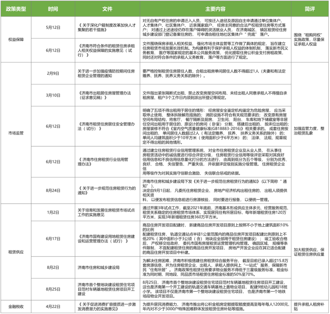 上海、廣州、重慶、杭州、西安、成都、合肥、??诘瘸鞘姓咧饕性趶娀袌鲲L險監(jiān)管方面。濟南在租賃供給、監(jiān)管和權(quán)益保障等多方面均有相關(guān)政策的推出,力度較大;具體在租售同權(quán)、增加房源供應、搭建監(jiān)管平臺、對企業(yè)和租客實施補貼方面全方位推進。