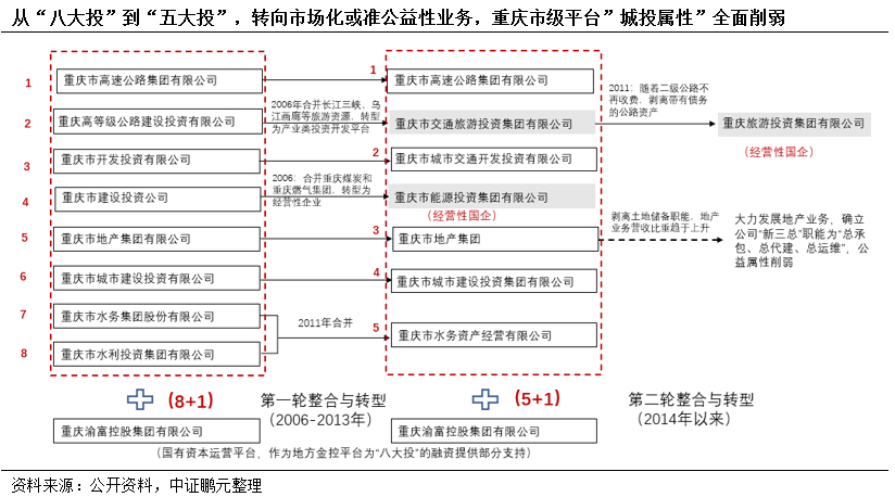 2010年6月10日,國務院印發(fā)《關于加強地方政府融資平臺公司管理有關問題的通知》(國發(fā)〔2010〕19號),各部委出臺了一系列文件,開始規(guī)范融資平臺的債務約束和轉型。2012年起,重慶“八大投”轉為“五大投”,此次轉型目標除兼并重組、降低債務、提高運營效率外,更重要的是調整產業(yè)結構,將城市基礎設施占比降到30%,提高工業(yè)服務業(yè)的發(fā)展,同時引導民營經濟集群發(fā)展,從而提供當地經濟發(fā)展質量、解決隱債問題。