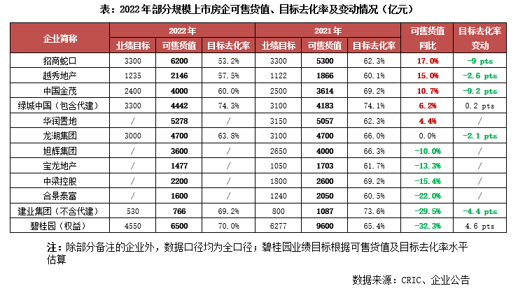 此外,2022年也有不少規模房企主動降速,如旭輝、寶龍、中梁、合景泰富、建業、碧桂園等,全年總可售貨值較去年降低較為明顯,降幅在10%-30%范圍。這類房企多未公開披露全年業績目標,或者目標較2021年有大幅回落。