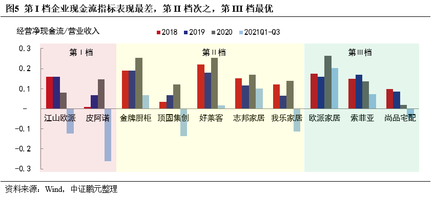 大宗業務占比高或大宗客戶風險大的樣本企業經營現金流弱化。2021年下半年以來房企流動性緊張,直接影響定制家居企業回款。江山歐派和皮阿諾經營現金流指標在2021年1-9月出現明顯的下滑,頂固集創由于積極推進大宗業務,業務合作保證金支出較大拖累經營現金流,我樂家居2021年半年報顯示其應收賬款前五大均為恒大地產、華夏幸福及金科地產的關聯企業。尚品宅配不涉及大宗業務,其經營現金流指標弱化則是由于戰略調整,全面轉型整裝業務所致。