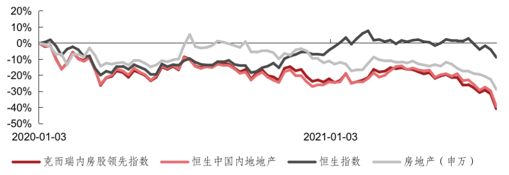 與之相對(duì)應(yīng)的是,自去年以來A股、港股地產(chǎn)股整體表現(xiàn)低迷。克而瑞證券監(jiān)測(cè)數(shù)據(jù)顯示,2020年1月1日至今,克而瑞內(nèi)房股領(lǐng)先指數(shù)跌幅40.7%,同期恒生中國(guó)內(nèi)地地產(chǎn)指數(shù)跌幅39.3%。