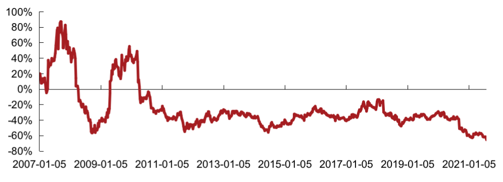 2021年7月相對(duì)恒指成分股的PE周均值為-62.4%,低于上月相對(duì)PE周均值-60.1%,低于2020年全年相對(duì)PE周均值-41.3%。克而瑞內(nèi)房股領(lǐng)先指數(shù)成分股整體PE 2021年7月周均值為5.55,低于上月周均值6.24,低于2020年全年周均值7.17。