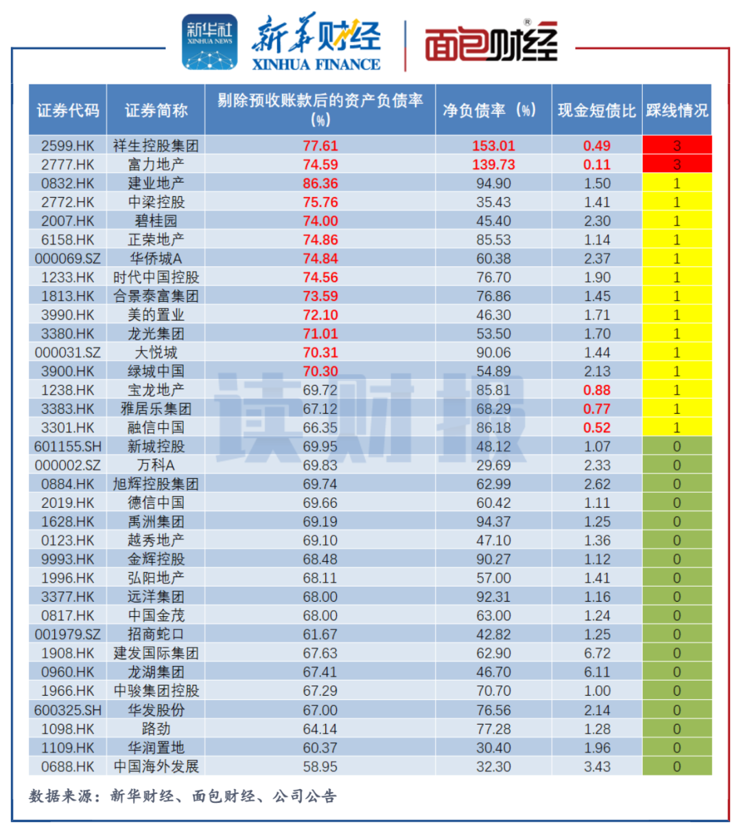 “三道紅線”是指剔除預收款的資產負債率不得大于 70%;凈負債率不得大于 100%;現金短債比不得小于1倍。根據“三道紅線”的觸線情況,房企分為“紅、橙、黃、綠”四檔。