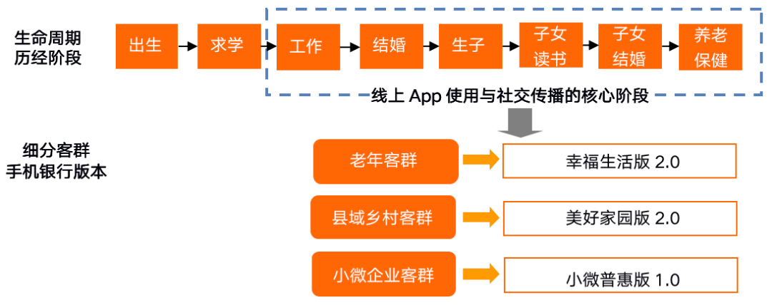 多種界面的手機銀行,也是圍繞人生必經(jīng)的發(fā)展階段而展開設(shè)計。從出生、求學、工作到養(yǎng)老保健等環(huán)節(jié),零售用戶與智能設(shè)備之間的智能連接關(guān)系日漸緊密。從手機銀行的使用客群年齡來看,主要是工作后的用戶群體為主。同時,針對不同身份特征的人群,手機銀行也細分為多個版本。工商銀行7.0版本手機銀行,分為三個細分人群專屬界面,即針對老年客群的幸福生活版2.0、針對縣域農(nóng)村人群的美好家園版2.0、針對小微企業(yè)主的小微普惠版1.0,前兩個界面是對此前發(fā)布版本的進一步優(yōu)化。