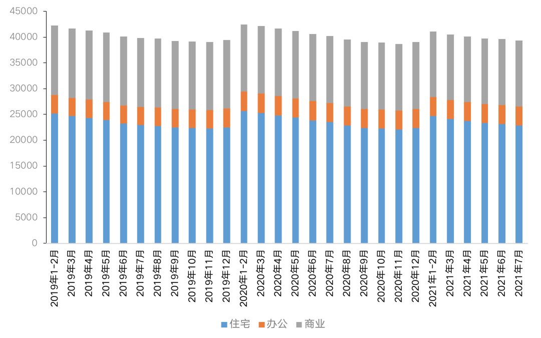 2021年以來(lái),全國(guó)整體庫(kù)存穩(wěn)中有降,國(guó)家統(tǒng)計(jì)局公布數(shù)據(jù)顯示,7月末,商品房待售面積50864萬(wàn)平方米,比6月末減少215萬(wàn)平方米。其中,住宅待售面積減少270萬(wàn)平方米,辦公樓待售面積減少26萬(wàn)平方米,商業(yè)營(yíng)業(yè)用房待售面積增加19萬(wàn)平方米。