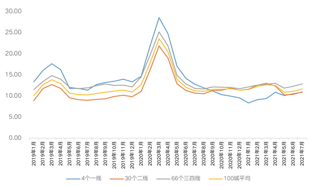由于7月整體供需兩淡,整體成交增長(zhǎng)也有轉(zhuǎn)弱的趨勢(shì),狹義庫(kù)存與上月基本持平,去化周期為11.67個(gè)月。分能級(jí)來(lái)看,一線成交熱度延續(xù),市場(chǎng)韌性較強(qiáng),去化周期環(huán)比微增至10.86個(gè)月,但仍顯著低于2020年同期水平。二三線去化周期同環(huán)比齊增,維持在11-13個(gè)月左右,整體庫(kù)存風(fēng)險(xiǎn)基本可控。