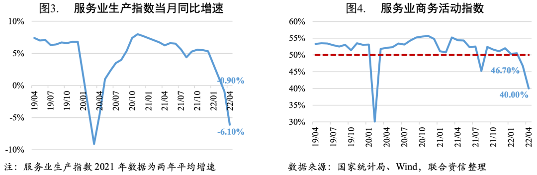 服務(wù)業(yè)生產(chǎn)收縮幅度進(jìn)一步擴(kuò)大。4月服務(wù)業(yè)生產(chǎn)指數(shù)同比下降6.10%,降幅較3月擴(kuò)大5.20個(gè)百分點(diǎn);4月服務(wù)業(yè)商務(wù)活動(dòng)指數(shù)也進(jìn)一步下滑至40%,為2020年3月以來的最低值。疫情防控所采取的封閉隔離等措施,對服務(wù)業(yè)造成重創(chuàng),其中消費(fèi)性服務(wù)業(yè)及部分民生保障類服務(wù)行業(yè)受到?jīng)_擊最大。