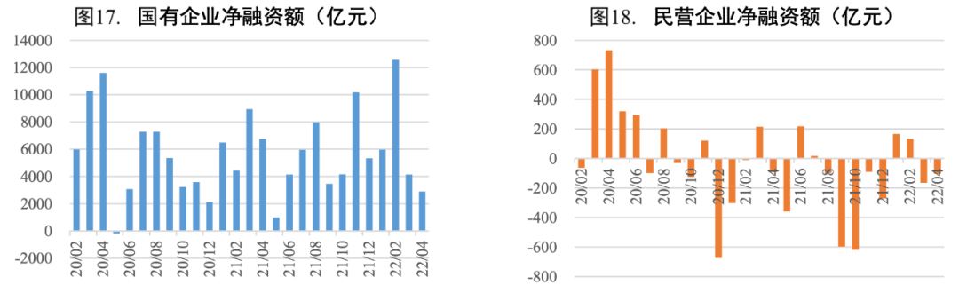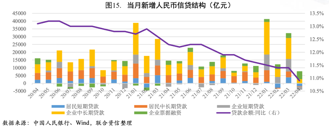 信貸總量走弱結(jié)構(gòu)欠佳,實(shí)體經(jīng)濟(jì)融資需求持續(xù)偏弱。4月金融機(jī)構(gòu)新增人民幣貸款6454億元,同比少增8231億元;4月末金融機(jī)構(gòu)人民幣貸款余額201.66萬億元,同比增長10.9%,增速分別比上月末和上年同期低0.5個(gè)和1.4個(gè)百分點(diǎn)。從結(jié)構(gòu)看,4月居民短期、中長期貸款新增規(guī)模均為負(fù),同比分別少增2221億元、5232億元,反映出受疫情沖擊和房地產(chǎn)市場預(yù)期弱化影響,居民消費(fèi)意愿和購房意愿依舊偏弱。企業(yè)中長期貸款同比少增3953億元,企業(yè)短期貸款、票據(jù)融資同比分別少減199億元、多增2437億元,顯示企業(yè)貸款結(jié)構(gòu)進(jìn)一步短期化。4月下旬以來票據(jù)轉(zhuǎn)貼現(xiàn)利率大幅下行,表明銀行票據(jù)沖量行為仍在延續(xù),反映出受疫情沖擊、要素短缺、原材料成本上漲等因素影響,企業(yè)特別是中小微企業(yè)經(jīng)營困難增多,有效融資需求明顯下降。后續(xù)看,隨著國內(nèi)疫情逐步緩和,疊加各類穩(wěn)增長政策提速發(fā)力,強(qiáng)化對重點(diǎn)領(lǐng)域和薄弱環(huán)節(jié)支持力度,實(shí)體經(jīng)濟(jì)融資需求好轉(zhuǎn),信貸總量及結(jié)構(gòu)或?qū)⒅鸩礁纳啤?/p>