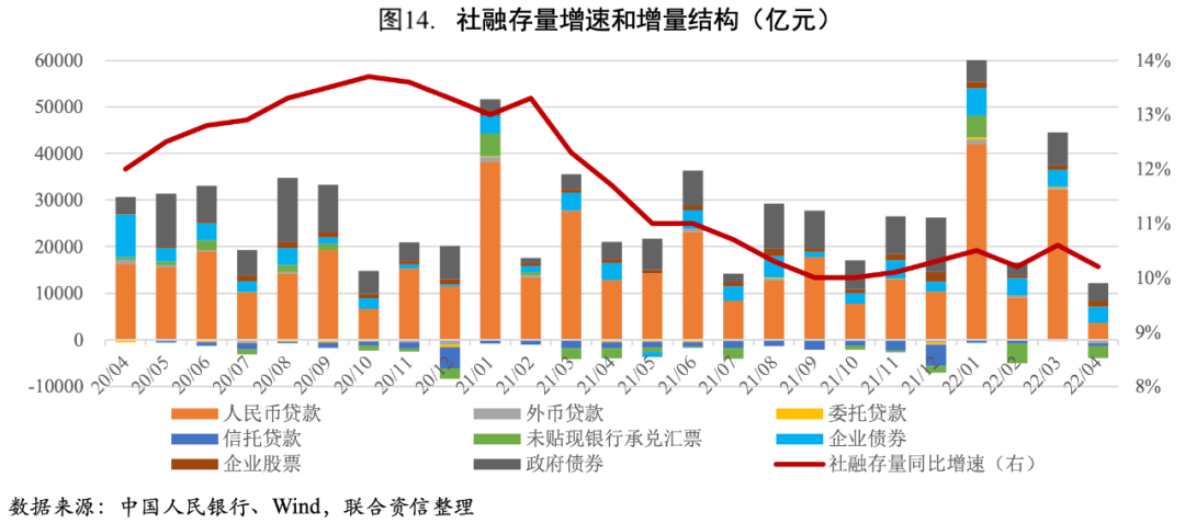 2022年4月,疫情對實(shí)體經(jīng)濟(jì)的影響進(jìn)一步顯現(xiàn),疊加房地產(chǎn)市場預(yù)期弱化、要素短缺及原材料等生產(chǎn)成本上漲等因素影響,居民消費(fèi)意愿和購房意愿依舊偏弱,企業(yè)經(jīng)營困難增多,有效融資需求明顯下降,社融總量與結(jié)構(gòu)雙雙走弱。央行綜合運(yùn)用多種貨幣政策工具,保持流動(dòng)性合理充裕,充分發(fā)揮貸款市場報(bào)價(jià)利率改革效能,發(fā)揮存款利率市場化調(diào)整機(jī)制作用,推動(dòng)降低企業(yè)綜合融資成本,著力改善信用環(huán)境。