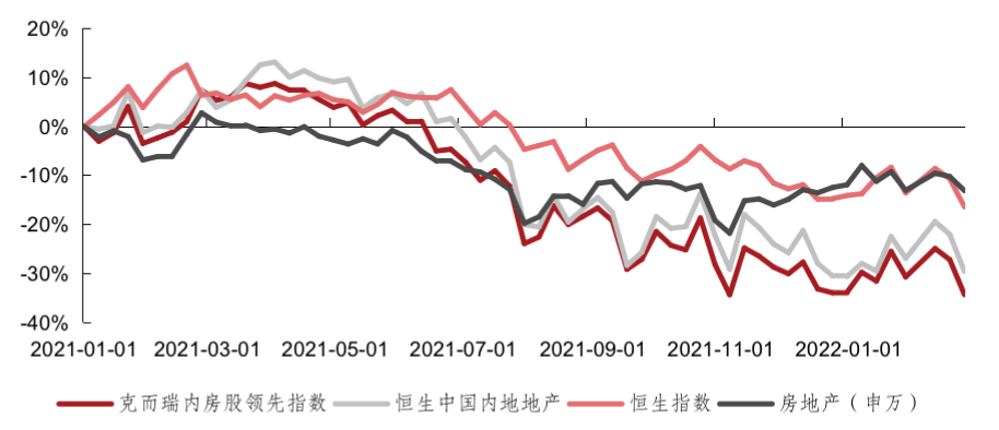 2021年1月1日以來,地產(chǎn)股震蕩下行。截止2月25日,克而瑞內(nèi)房股領(lǐng)先指數(shù)跌幅34.3%,同期恒生中國內(nèi)地地產(chǎn)指數(shù)跌幅29.6%。恒生指數(shù)跌幅16.4%,房地產(chǎn)(申萬)板塊跌幅13.1%。