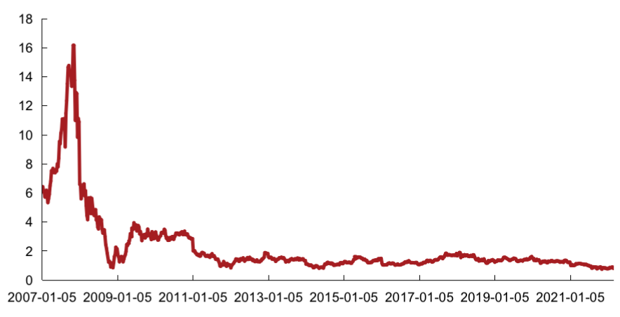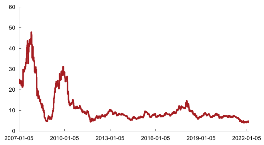 2022年2月相對恒指成分股的PE周均值為-64.4%,微低于上月相對PE周均值-64.3%,低于2021年全年相對PE周均值-61.0%??硕饍?nèi)房股領(lǐng)先指數(shù)成分股整體PE 2022年2月周均值為4.58,高于上月周均值4.50,低于2021年全年周均值5.75。