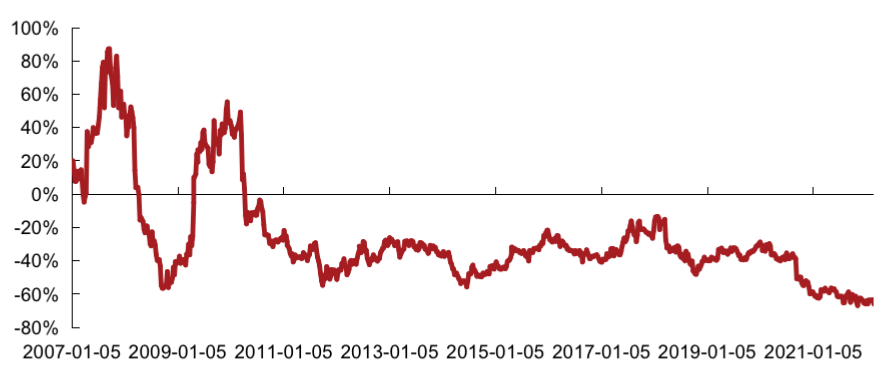 市凈率方面,克而瑞內(nèi)房股領(lǐng)先指數(shù)成分股PB相對恒指成分股2月小幅震蕩,總體繼續(xù)下行并維持低位。2月相對恒指PB周均值為-0.9% ,低于上月的周均值-0.1%,低于2021年全年相對恒指PB周均值22.5%。