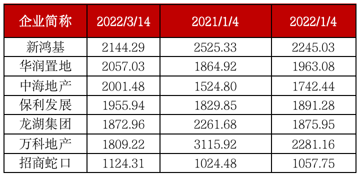 表:88家樣本企業(yè)中千億市值房企最新市值與2021、2022初對比(單位:億元)