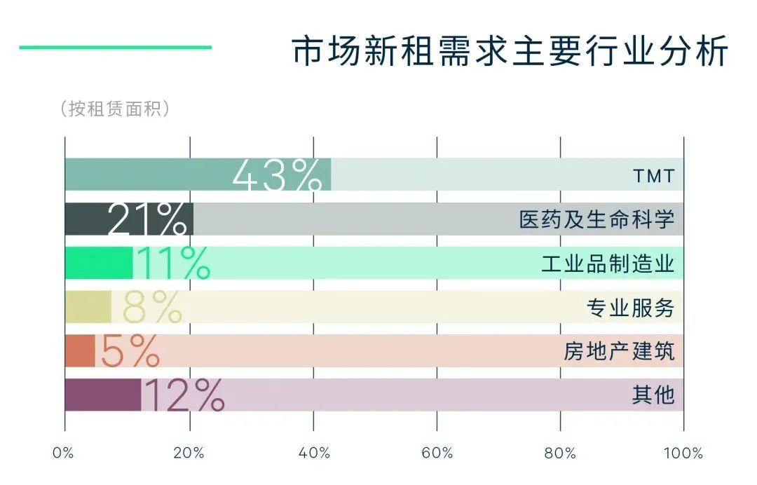 需求端看,一季度,金融重回新租需求行業(yè)榜首(占比32%),其中證券、基金以及金融科技擴(kuò)租需求強(qiáng)勁。TMT的新租需求則集中在軟件開發(fā)、互聯(lián)網(wǎng)+消費服務(wù)及人工智能等領(lǐng)域。