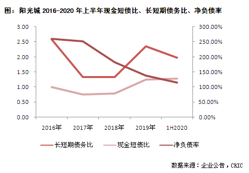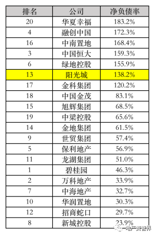 地產行業通常用凈負債率來衡量企業負債((有息負債-貨幣資金)/ 所有者權益),2019年末,陽光城該指標達到138%,屬于較高水平,在當年前20強企業中位居第6。