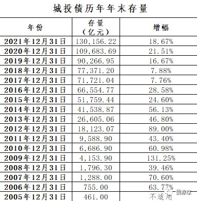 多年來,可以說我國信用債市場基本圍繞著城投債在高歌猛進中發(fā)展,中間雖有起伏,但是總體向上的趨勢一直沒有改變。從筆者統(tǒng)計的數(shù)據(jù)來看,城投債存量從2005年末的461億,已經增長到2021年的130156億元,增幅達280多倍。