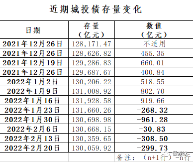 280多倍,非常驚人的數(shù)據(jù),然而在持續(xù)大幅增長之后,近期的數(shù)據(jù)開始出現(xiàn)了相反的變化。步入2022年,從1月下旬開始,城投債存量出現(xiàn)了異乎往常的負增長,截止目前為止,已經持續(xù)5周。