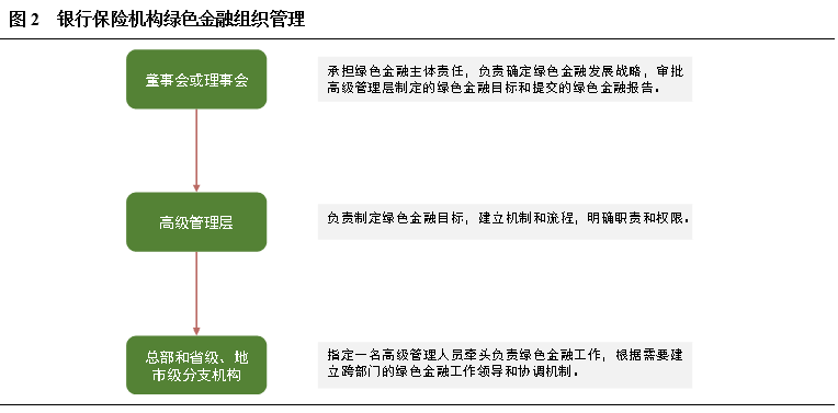 在銀行保險機構綠色金融業(yè)務的組織管理上,《指引》提到構建自上而下的管理流程:董事會或理事會承擔綠色金融主體責任,負責確定綠色金融發(fā)展戰(zhàn)略,審批高級管理層制定的綠色金融目標和提交的綠色金融報告;高級管理層應當根據(jù)董事會或理事會的決定,制定綠色金融目標,每年度向董事會或理事會報告綠色金融發(fā)展情況;總部和省級、地市級分支機構應當指定一名高級管理人員牽頭負責綠色金融工作。