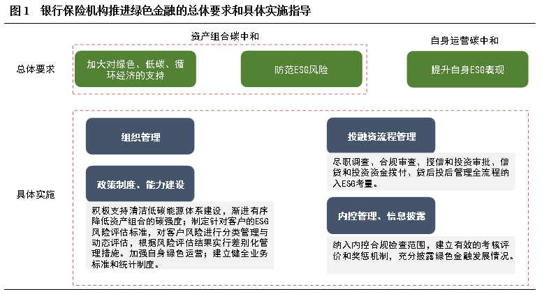 《指引》提出銀行保險業(yè)推進綠色金融工作的總體要求包括三個方面:加大對綠色、低碳、循環(huán)經(jīng)濟的支持;防范ESG風險;提升自身ESG表現(xiàn)。最終推動銀行保險機構實現(xiàn)“資產(chǎn)組合碳中和”和“自身運營碳中和”。具體實施上,《指引》從組織管理、政策制度、能力建設、投融資流程管理、內控管理、信息披露方面全面指導銀行保險機構綠色金融業(yè)務。需要注意的是,《指引》是第一份保險業(yè)綠色金融發(fā)展指導文件,且對保險機構資產(chǎn)端和負債端均提出了綠色發(fā)展要求,保險機構要積極開展綠色保險和資金運用,加大對綠色低碳發(fā)展的風險保障和資金支持。