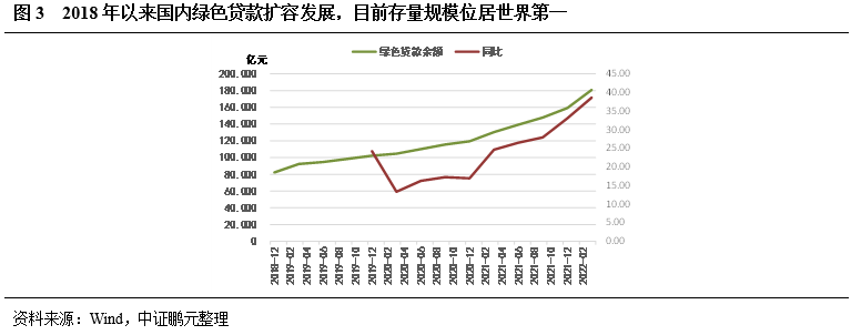 在這些政策的推動下,國內綠色貸款規(guī)模不斷擴容發(fā)展。根據(jù)人民銀行相關數(shù)據(jù),2022年一季度末,綠色貸款余額18.07為萬億元,同比增長38.6%,增速創(chuàng)新高。目前,國內綠色貸款存量規(guī)模位居世界第一位。