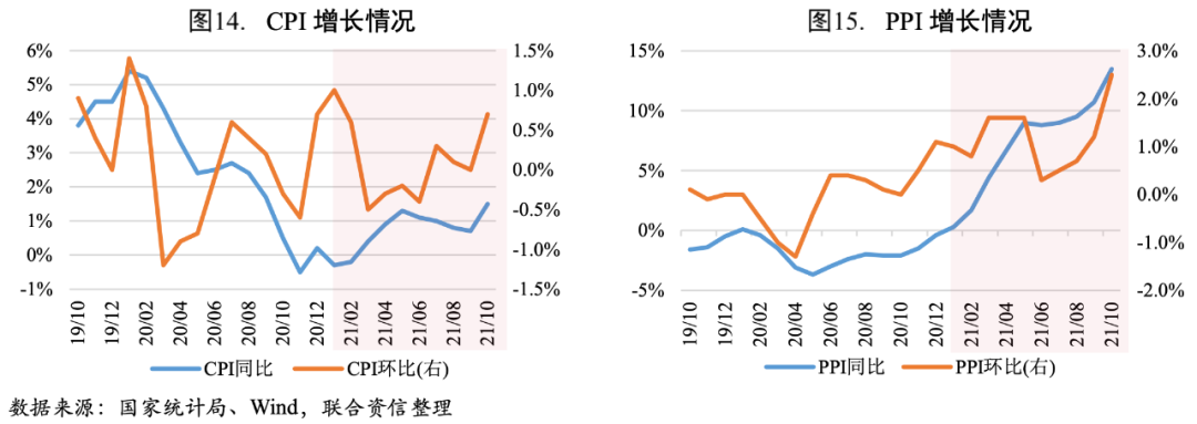 CPI同比和環比漲幅均擴大。2021年10月CPI同比漲幅擴大0.80個百分點至1.50%,環比漲幅較上月擴大0.70個百分點至0.70%。強降雨天氣推動鮮菜價格上漲、國際原油價格上漲推動國內燃料價格走高、PPI價格對工業消費品價格的傳導,共同推高CPI漲幅擴大。11月以來豬肉、鮮菜價格繼續上漲,疊加上年的低基數因素,預計11月CPI同比漲幅繼續擴大,但在消費需求疲弱的影響下,CPI漲幅有限。