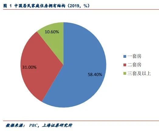 該報告還引述2019 年中國人民銀行發布的《2019年中國城鎮居民家庭資產負債情況調查》報告顯示,中國居民戶均擁有住房1.5套,有兩套住房的占比為31.0%,有三套及以上住房的占比為10.5%。如下圖。