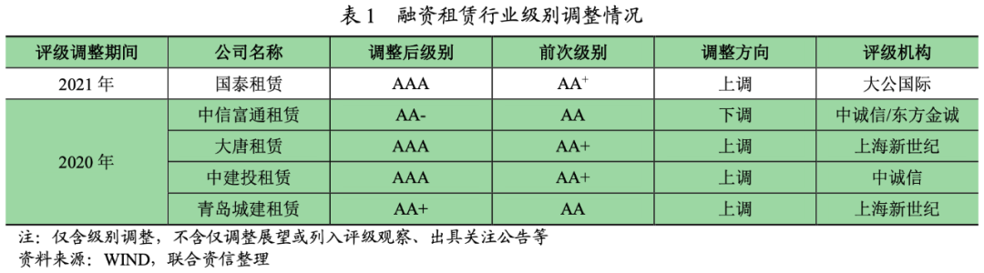 2021年以來,依據(jù)公開可查資料,新增1家融資租賃公司(以下分析均不包含金融租賃公司)發(fā)生信用等級(jí)遷移,即國泰租賃評(píng)級(jí)發(fā)生上調(diào),無新增有公布的評(píng)級(jí)下調(diào)的融資租賃公司。
