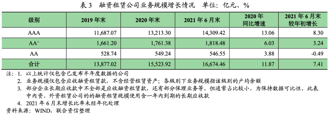 2021年以來,受疫情反復(fù)的影響,為了保持市場穩(wěn)定,資本市場資金面整體較為寬裕。從樣本公司經(jīng)營情況來看,2021年上半年,AAA級(jí)別[4]融資租賃公司業(yè)務(wù)規(guī)模較年初增長較快,主要系部分資質(zhì)較好的企業(yè)負(fù)債端再融資壓力相對(duì)較小,因此其在資產(chǎn)端能夠持續(xù)擴(kuò)大投放規(guī)模所致;AA+、AA級(jí)別融資租賃公司業(yè)務(wù)規(guī)模增速顯著低于AAA級(jí)別融資租賃公司,主要系行業(yè)內(nèi)部競爭加劇,實(shí)力偏弱的融資租賃公司面臨更大的壓力,需要注意的是,AA級(jí)別融資租賃公司業(yè)務(wù)規(guī)模較年初已經(jīng)出現(xiàn)小幅下滑的情況,未來需要對(duì)低評(píng)級(jí)公司的業(yè)務(wù)發(fā)展趨勢(shì)保持關(guān)注。另外,樣本內(nèi)能夠獲取到完整數(shù)據(jù)的融資租賃公司以中高級(jí)別居多,該部分企業(yè)通常資質(zhì)較好,受到外部融資環(huán)境結(jié)構(gòu)性緊張的影響相對(duì)較小,因此本文中樣本統(tǒng)計(jì)數(shù)據(jù)會(huì)與行業(yè)實(shí)際平均水平有一定的偏差。