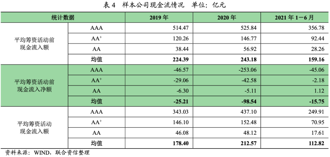 從業(yè)務(wù)內(nèi)生現(xiàn)金流來看,2020年,樣本公司平均籌資活動(dòng)前現(xiàn)金流入額實(shí)現(xiàn)同比增長。分結(jié)構(gòu)來看,AAA、AA+和AA級(jí)別的樣本公司平均籌資活動(dòng)前現(xiàn)金流入額均實(shí)現(xiàn)了同比增長。2021年上半年,樣本公司平均籌資活動(dòng)前現(xiàn)金流入額較為平穩(wěn),表明樣本公司正常經(jīng)營產(chǎn)生的現(xiàn)金回流處于較為平穩(wěn)的狀態(tài)。