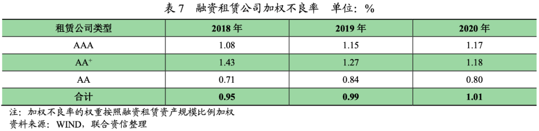 從不良率來看,樣本公司的不良率呈現(xiàn)持續(xù)增長趨勢(shì)。分級(jí)別來看,AAA和AA級(jí)別的融資租賃公司不良率持續(xù)增長,但是,AAA不良率整體仍然處于較低水平。AA級(jí)別的融資租賃公司不良率增長速度更快,風(fēng)險(xiǎn)資產(chǎn)暴露更迅速。
