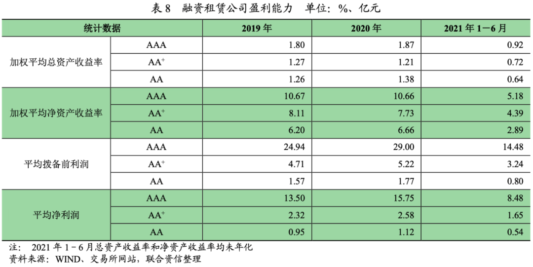 從利潤規(guī)模來看,2020年,AAA、AA+和AA級(jí)別融資租賃公司的平均撥備前利潤同比增長16.29%、10.74%和12.46%。2020年,AAA、AA+和AA級(jí)別融資租賃公司的平均凈利潤同比增長16.71%、10.85%和17.50%,AA級(jí)別融資租賃公司平均凈利潤增速最快,增速超過AAA級(jí)別融資租賃公司,其中AA級(jí)別融資租賃公司計(jì)提的減值準(zhǔn)備比例較低是原因之一。2021年上半年,AAA、AA+和AA級(jí)別融資租賃公司的平均凈利潤同比增長28.51%、33.08%和4.14%,各級(jí)別融資租賃公司凈利潤均實(shí)現(xiàn)增長,但是增速分化明顯。