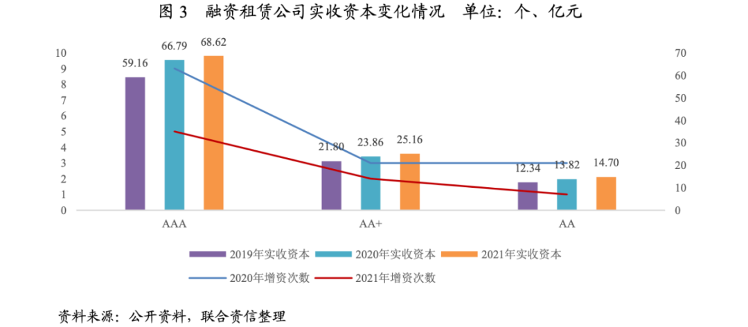 原本定位于服務(wù)集團(tuán)內(nèi)企業(yè)的融資租賃公司為了降低客戶集中度,在拓展集團(tuán)外業(yè)務(wù)時(shí),風(fēng)險(xiǎn)把控將是一個(gè)巨大挑戰(zhàn),尤其是開展不同于集團(tuán)所處行業(yè)的業(yè)務(wù)時(shí),融資租賃公司應(yīng)該不斷提升風(fēng)險(xiǎn)把控能力,做好客戶準(zhǔn)入、授信等工作。在杠桿倍數(shù)方面,2021年融資租賃公司杠桿倍數(shù)整體呈現(xiàn)下降跡象。《暫行辦法》對(duì)融資租賃公司的杠桿倍數(shù)提出了明確要求,并且各地監(jiān)管細(xì)則對(duì)杠桿倍數(shù)指標(biāo)基本都保持了《暫行辦法》的要求。因此,融資租賃公司有增加資本金的強(qiáng)烈需求。從實(shí)收資本指標(biāo)來看,融資租賃公司已經(jīng)開始行動(dòng)起來,逐漸增加資本金。2020年,共有15家樣本融資租賃公司完成增資。2021年上半年,共有8家樣本融資租賃公司完成增資。分級(jí)別來看,各級(jí)別融資租賃公司實(shí)收資本在2020年和2021年均有所增長,但是,高級(jí)別融資租賃公司完成增資的公司數(shù)量明顯高于低級(jí)別融資租賃公司。尚未達(dá)到監(jiān)管標(biāo)準(zhǔn)的融資租賃公司應(yīng)該盡快降低杠桿倍數(shù)。在補(bǔ)充資本之外,高杠桿融資租賃公司可能會(huì)適當(dāng)壓縮業(yè)務(wù)。