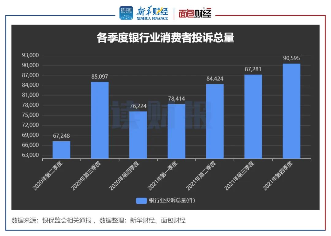 統(tǒng)計(jì)數(shù)據(jù)顯示,2021年銀保監(jiān)會(huì)處理銀行業(yè)消費(fèi)投訴340714件。其中,第四季度處理投訴90595件,環(huán)比增長(zhǎng)3.8%。2021全年各季度處理投訴量呈現(xiàn)出同比、環(huán)比均逐季增長(zhǎng)的趨勢(shì)。