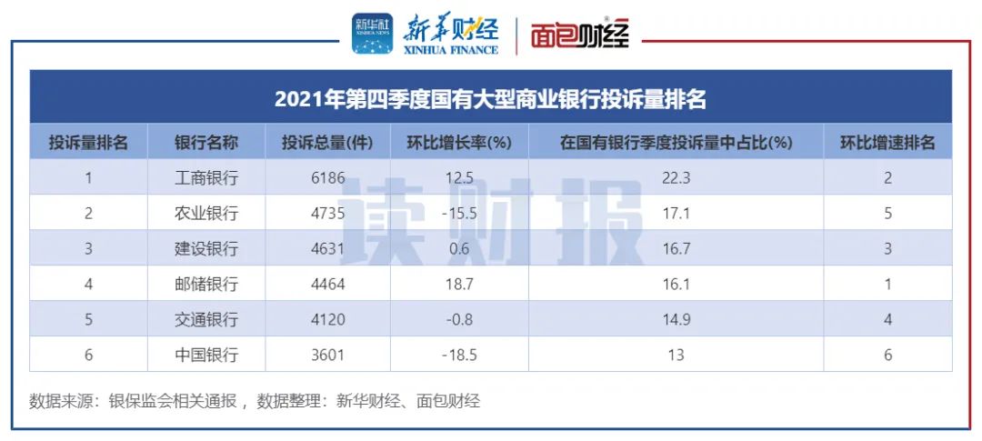 與第三季度相比,郵儲(chǔ)銀行投訴量環(huán)比增長(zhǎng)18.7%,增速排名第一;工商銀行以12.5%的增速,排在第二位。