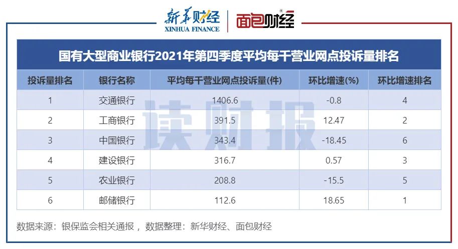 國(guó)有銀行被投訴量排名:工行總量大、郵儲(chǔ)增速快、交行密度高