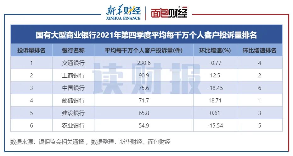 交通銀行2021年第四季度兩項(xiàng)指標(biāo)均位列國(guó)有銀行首位且明顯高于其他國(guó)有銀行,顯示出該銀行的相關(guān)業(yè)務(wù)服務(wù)質(zhì)量和消費(fèi)者權(quán)益保護(hù)水平亟待提升。