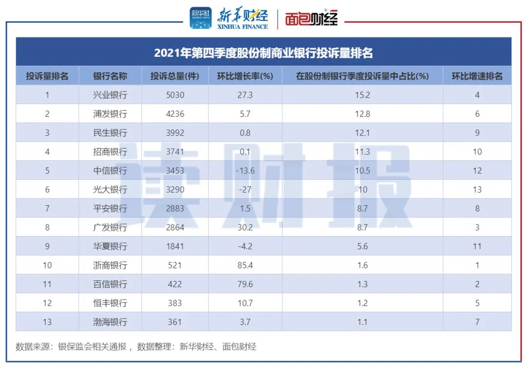 2021年第四季度,興業(yè)銀行、浦發(fā)銀行和民生銀行的消費(fèi)者投訴量位居股份制銀行前三名。其中,興業(yè)銀行投訴總量高達(dá)5030件,是唯一一家季度投訴量超過(guò)5000件的股份制銀行。