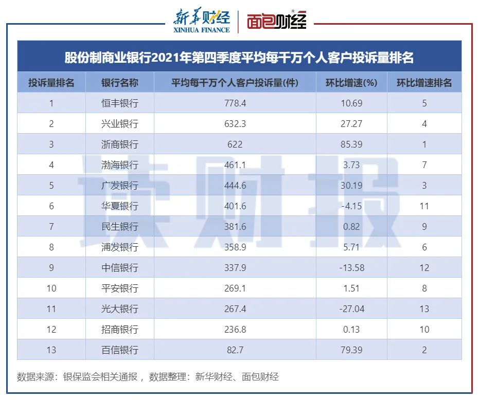 以每千萬(wàn)個(gè)人客戶投訴量排名,2021年第四季度,恒豐銀行、興業(yè)銀行和浙商銀行位居股份制銀行前三名。按照季度環(huán)比增速排名,浙商銀行和百信銀行增長(zhǎng)最快。光大銀行環(huán)比下降27.04%,在股份制銀行中降幅最大。