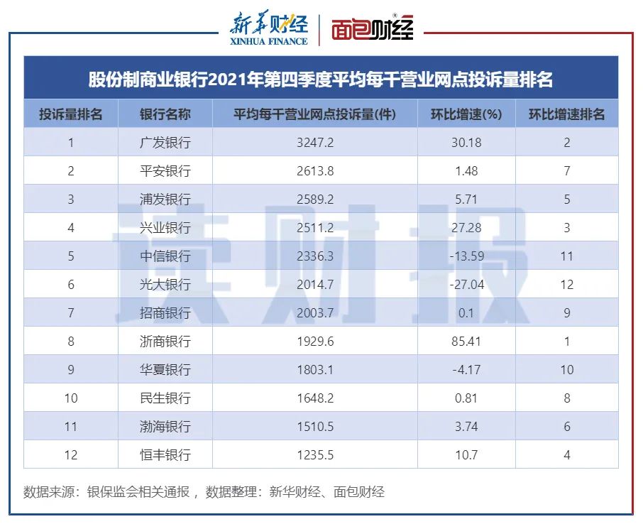 以平均每千營(yíng)業(yè)網(wǎng)點(diǎn)投訴量進(jìn)行統(tǒng)計(jì),廣發(fā)銀行位居股份制銀行首位,2021年第四季度該行平均每千營(yíng)業(yè)網(wǎng)點(diǎn)投訴量3247.2件,遠(yuǎn)高于其他股份制銀行。平安銀行和浦發(fā)銀行位列第二和第三。