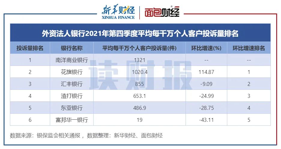 南洋商業(yè)銀行2021年第四季度平均每千萬(wàn)客戶投訴量位居外資行首位,達(dá)到1321件。