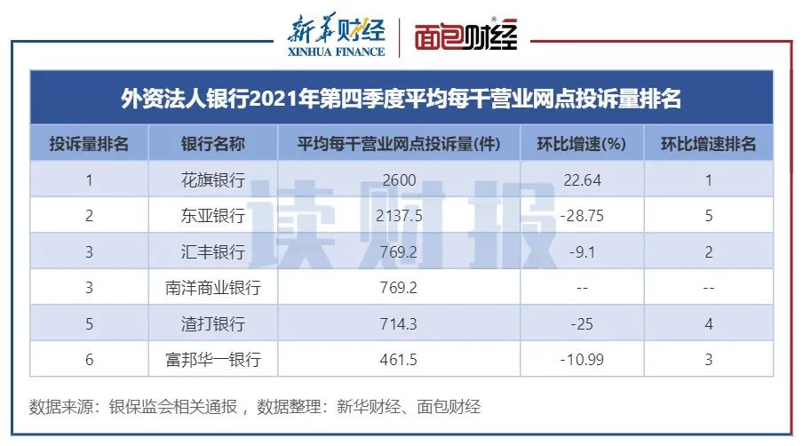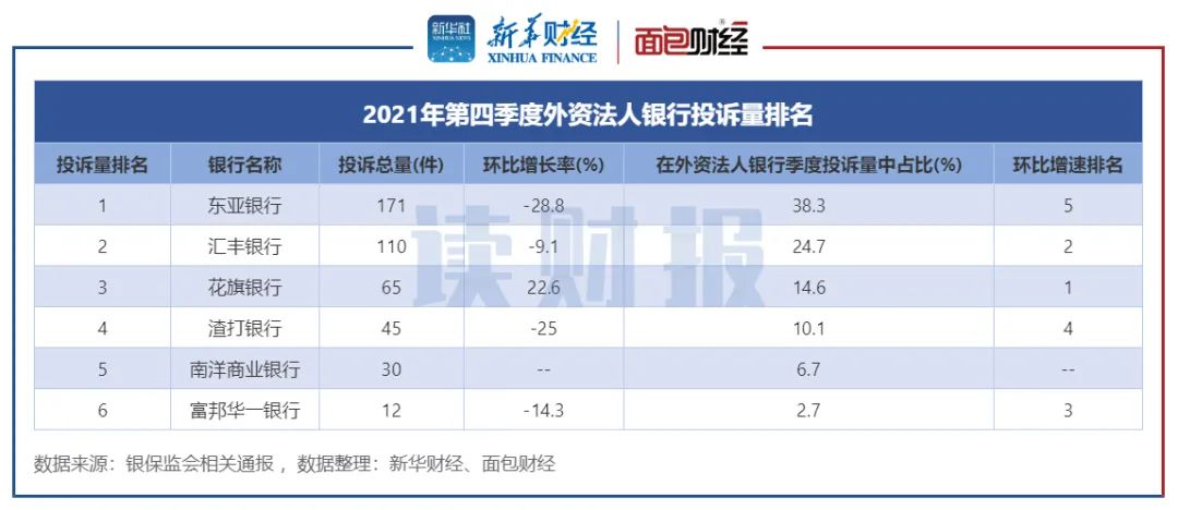 外資法人銀行中,2021年第四季度東亞銀行消費(fèi)者投訴總量位居榜首,花旗銀行投訴增速最快。
